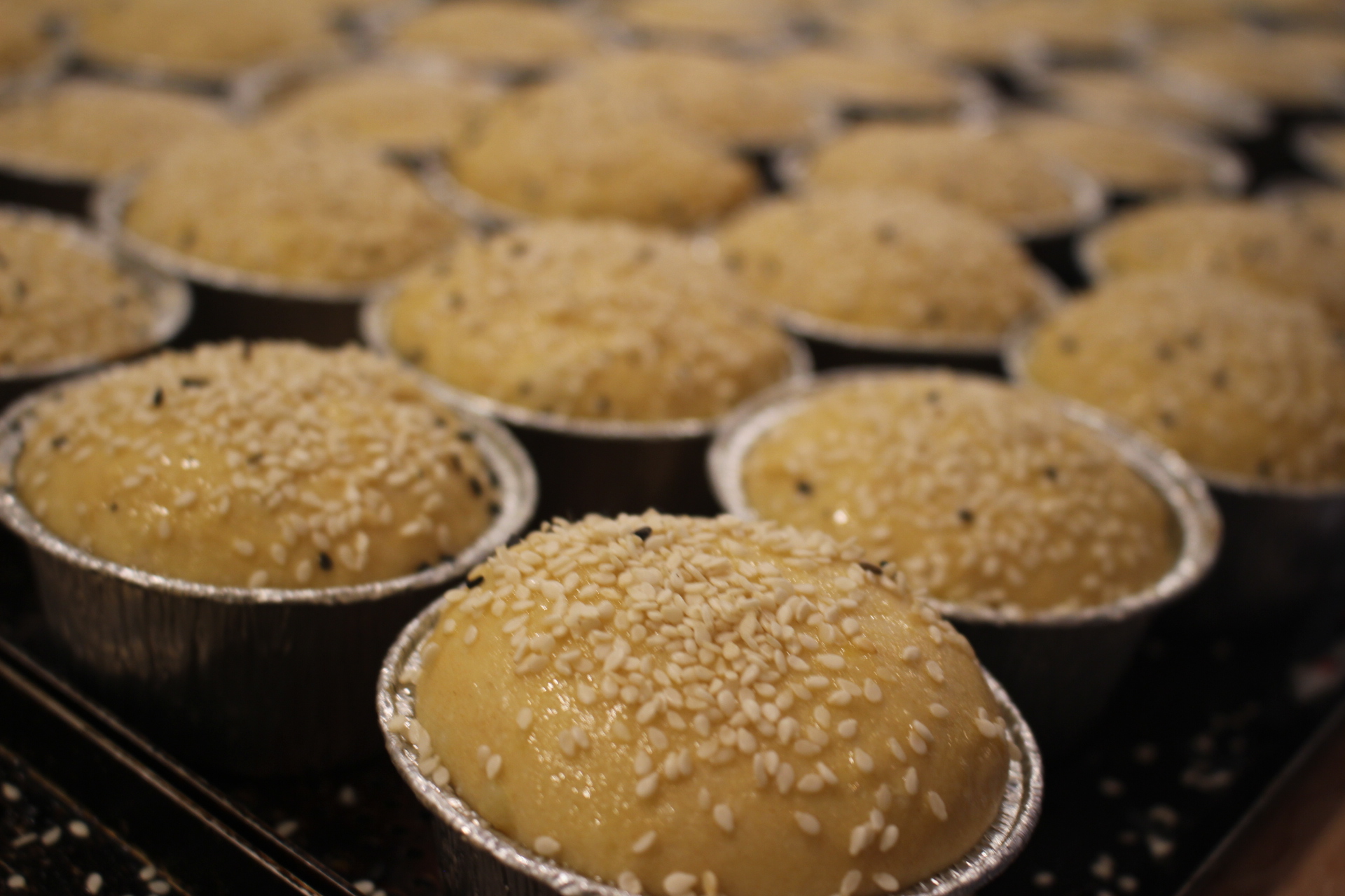 Læg dejen i en skål med film over. Hæv i 2-3 timer et lunt sted, til den har nået dobbelt størrelse. Del nu dejen op i ca. 20 små boller, som lægges i en smurt muffinform, bagering eller på en bradepande med bagepapir. Lad briocherne efterhæve 1 time. Pensl dem med æggeblomme og drys evt. med sesam.