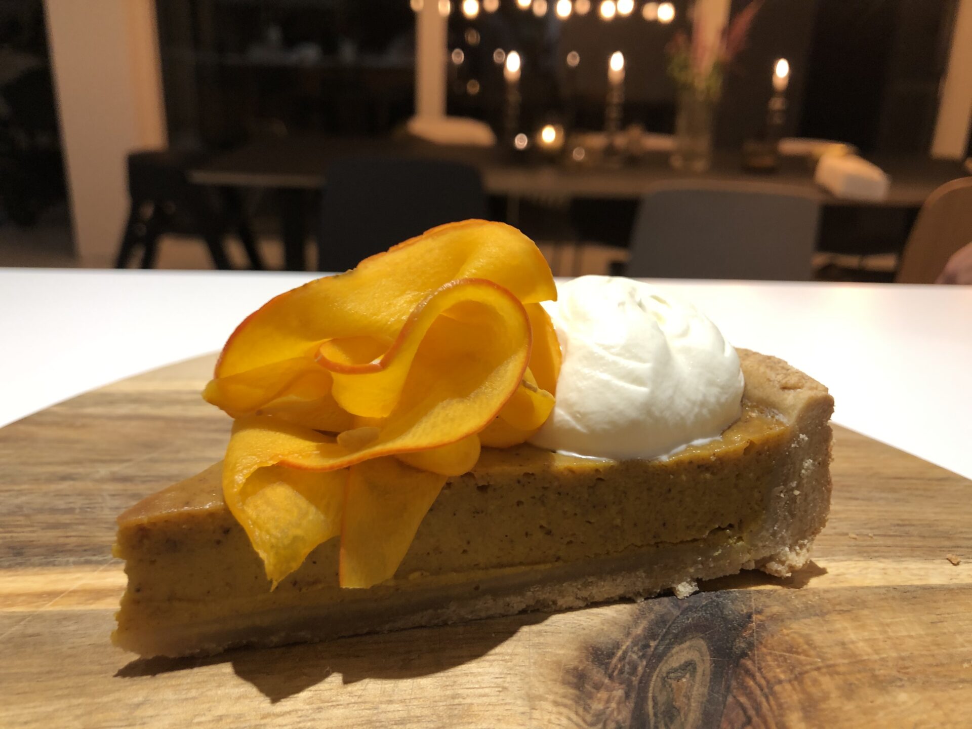 Græskartærten kan serveres på klassisk vis med ahornsirup og flødeskum på toppen. På fotoet har vi lavet tynde bånd af græskar med en skræller. Båndene er vendt i ahornsirup med en knivspids kardemomme og anrettet sammen med flødeskum på toppen af den afkølede tærte.
